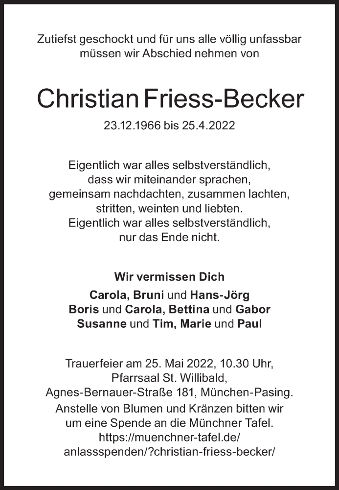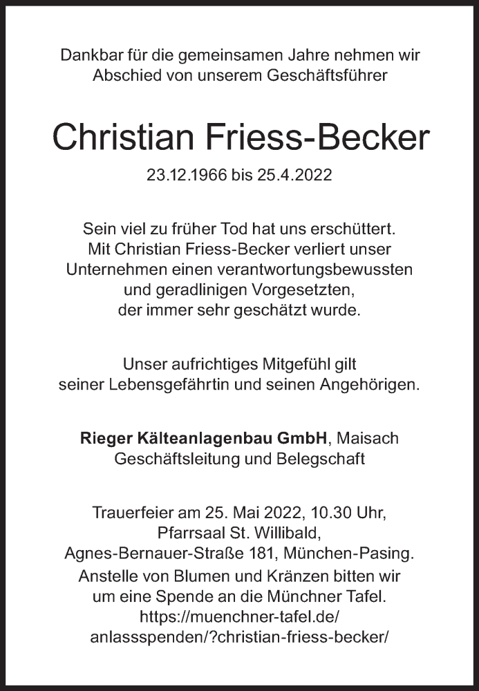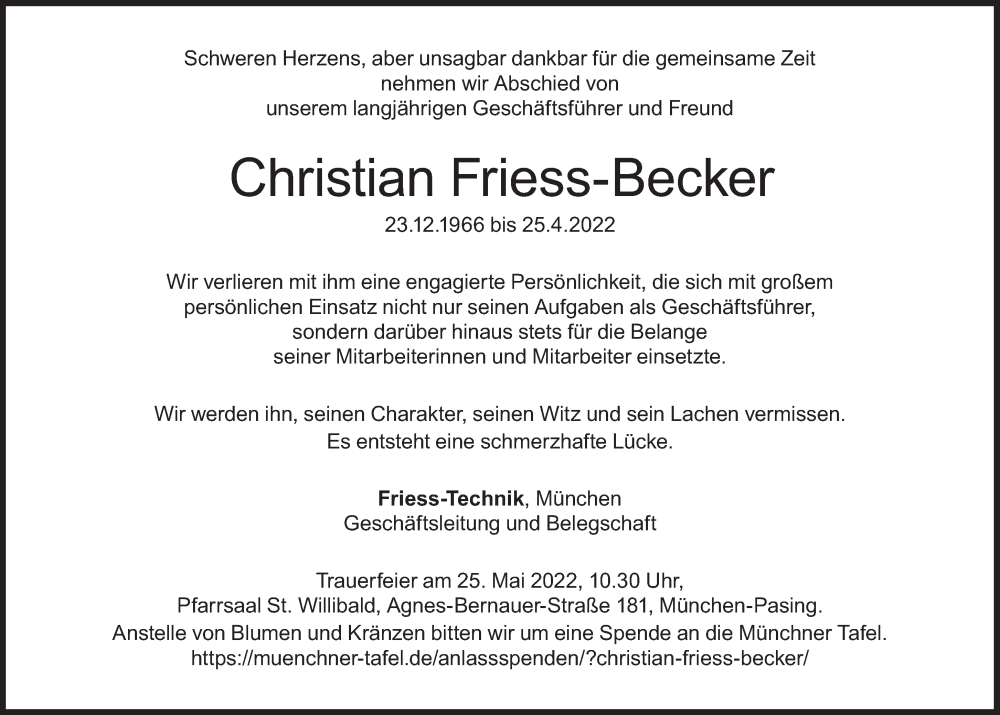 Hier finden Sie alle Traueranzeigen aus der Zeitung, die bisher für Christian Friess-Becker erschienen sind. Weitere Traueranzeigen, die in der Zeitung erscheinen, werden hier ebenfalls aufgelistet