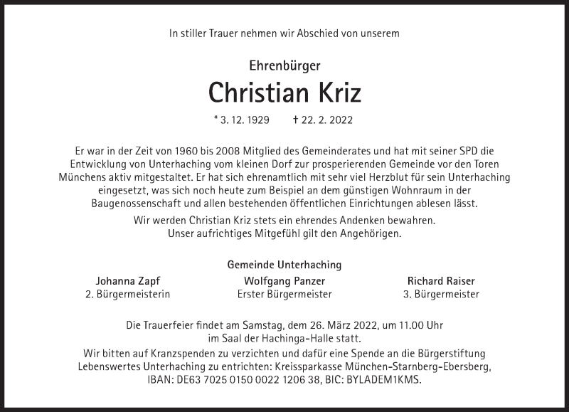Hier finden Sie alle Traueranzeigen aus der Zeitung, die bisher für Christian Kriz erschienen sind. Weitere Traueranzeigen, die in der Zeitung erscheinen, werden hier ebenfalls aufgelistet