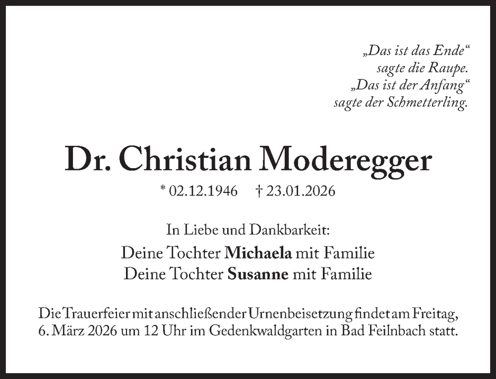Hier finden Sie alle Traueranzeigen aus der Zeitung, die bisher für Christian Moderegger erschienen sind. Weitere Traueranzeigen, die in der Zeitung erscheinen, werden hier ebenfalls aufgelistet