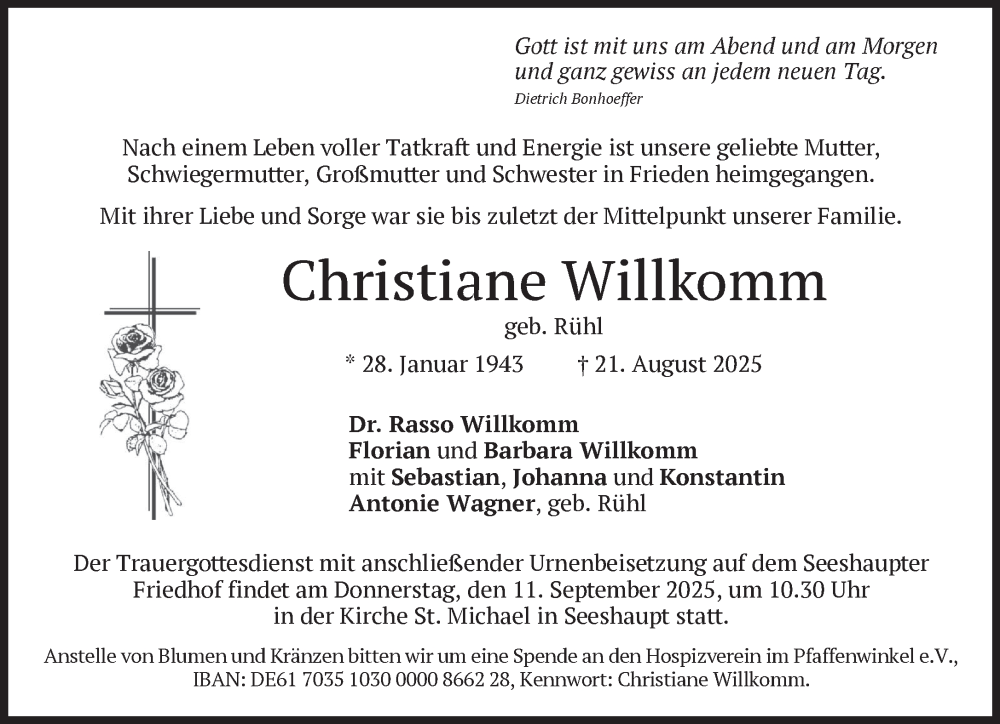 Hier finden Sie alle Traueranzeigen aus der Zeitung, die bisher für Christiane Willkomm erschienen sind. Weitere Traueranzeigen, die in der Zeitung erscheinen, werden hier ebenfalls aufgelistet