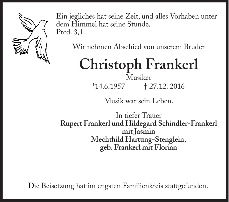 Hier finden Sie alle Traueranzeigen aus der Zeitung, die bisher für Christoph Frankerl erschienen sind. Weitere Traueranzeigen, die in der Zeitung erscheinen, werden hier ebenfalls aufgelistet