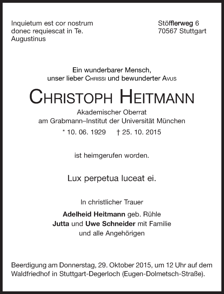 Hier finden Sie alle Traueranzeigen aus der Zeitung, die bisher für Christoph Heitmann erschienen sind. Weitere Traueranzeigen, die in der Zeitung erscheinen, werden hier ebenfalls aufgelistet