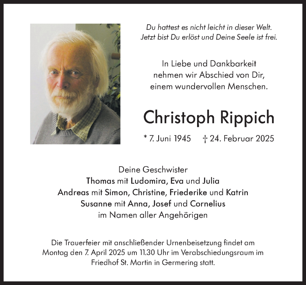 Hier finden Sie alle Traueranzeigen aus der Zeitung, die bisher für Christoph Rippich erschienen sind. Weitere Traueranzeigen, die in der Zeitung erscheinen, werden hier ebenfalls aufgelistet