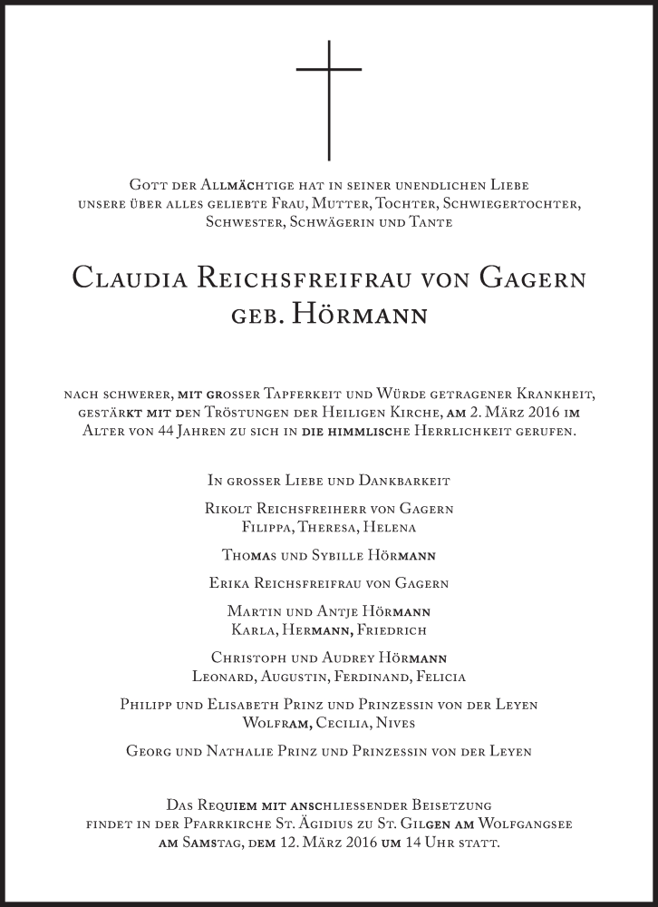 Hier finden Sie alle Traueranzeigen aus der Zeitung, die bisher für Claudia Reichsfreifrau von Gagern erschienen sind. Weitere Traueranzeigen, die in der Zeitung erscheinen, werden hier ebenfalls aufgelistet
