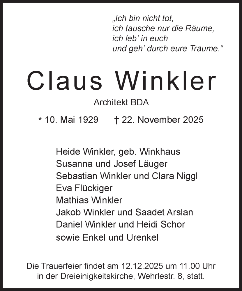 Hier finden Sie alle Traueranzeigen aus der Zeitung, die bisher für Claus Winkler erschienen sind. Weitere Traueranzeigen, die in der Zeitung erscheinen, werden hier ebenfalls aufgelistet