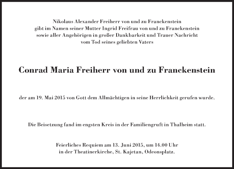 Hier finden Sie alle Traueranzeigen aus der Zeitung, die bisher für Conrad Maria Freiherr von und zu Franckenstein erschienen sind. Weitere Traueranzeigen, die in der Zeitung erscheinen, werden hier ebenfalls aufgelistet