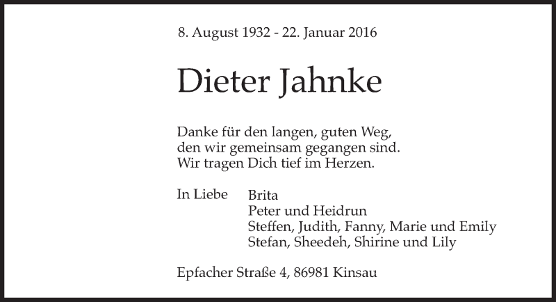 Hier finden Sie alle Traueranzeigen aus der Zeitung, die bisher für Dieter Jahnke erschienen sind. Weitere Traueranzeigen, die in der Zeitung erscheinen, werden hier ebenfalls aufgelistet