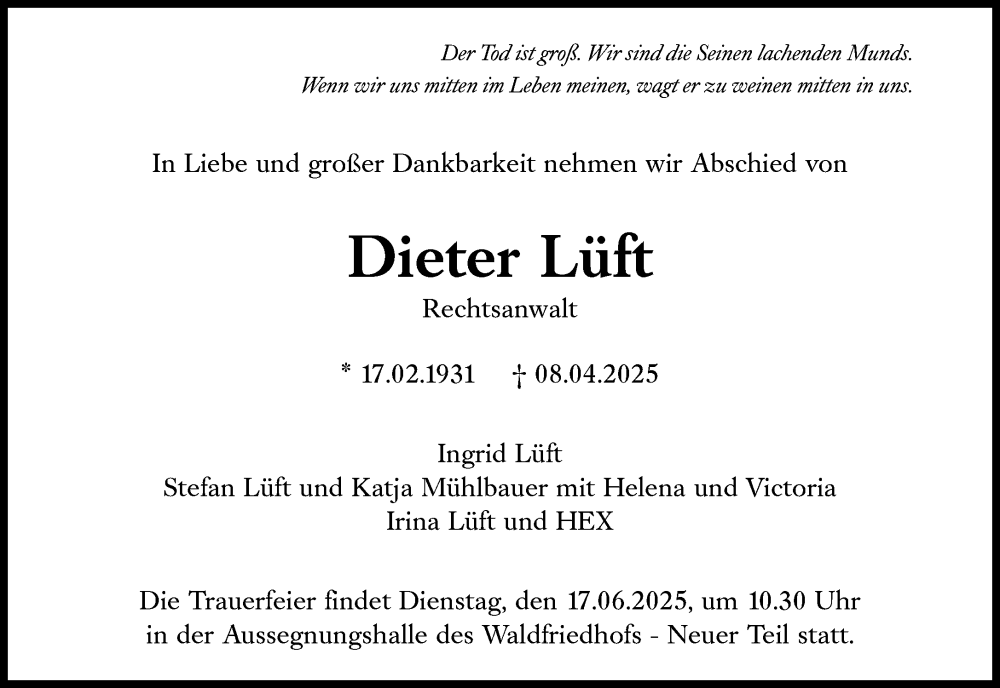 Hier finden Sie alle Traueranzeigen aus der Zeitung, die bisher für Dieter Lüft erschienen sind. Weitere Traueranzeigen, die in der Zeitung erscheinen, werden hier ebenfalls aufgelistet
