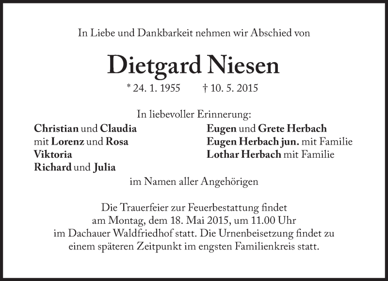 Hier finden Sie alle Traueranzeigen aus der Zeitung, die bisher für Dietgard Niesen erschienen sind. Weitere Traueranzeigen, die in der Zeitung erscheinen, werden hier ebenfalls aufgelistet