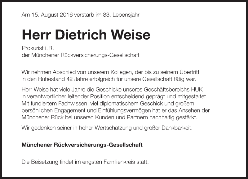 Hier finden Sie alle Traueranzeigen aus der Zeitung, die bisher für Dietrich Weise erschienen sind. Weitere Traueranzeigen, die in der Zeitung erscheinen, werden hier ebenfalls aufgelistet