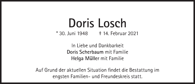 Hier finden Sie alle Traueranzeigen aus der Zeitung, die bisher für Doris Losch erschienen sind. Weitere Traueranzeigen, die in der Zeitung erscheinen, werden hier ebenfalls aufgelistet