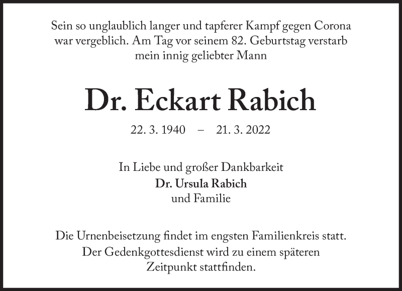 Hier finden Sie alle Traueranzeigen aus der Zeitung, die bisher für Eckart Rabich erschienen sind. Weitere Traueranzeigen, die in der Zeitung erscheinen, werden hier ebenfalls aufgelistet