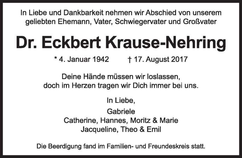 Hier finden Sie alle Traueranzeigen aus der Zeitung, die bisher für Eckbert Krause-Nehring erschienen sind. Weitere Traueranzeigen, die in der Zeitung erscheinen, werden hier ebenfalls aufgelistet