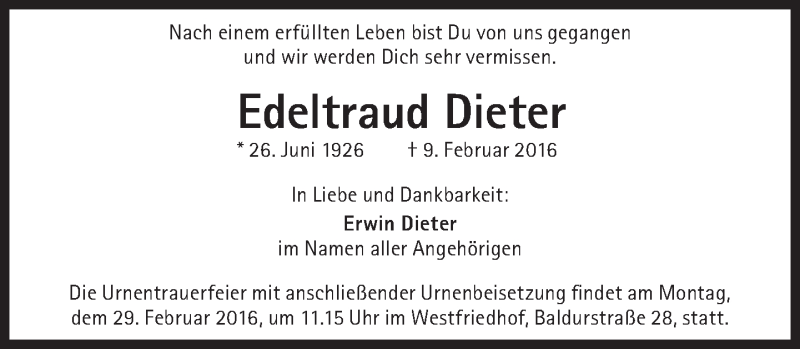 Hier finden Sie alle Traueranzeigen aus der Zeitung, die bisher für Edeltraud Dieter erschienen sind. Weitere Traueranzeigen, die in der Zeitung erscheinen, werden hier ebenfalls aufgelistet
