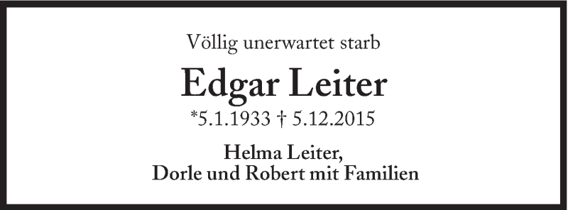 Hier finden Sie alle Traueranzeigen aus der Zeitung, die bisher für Edgar Leiter erschienen sind. Weitere Traueranzeigen, die in der Zeitung erscheinen, werden hier ebenfalls aufgelistet