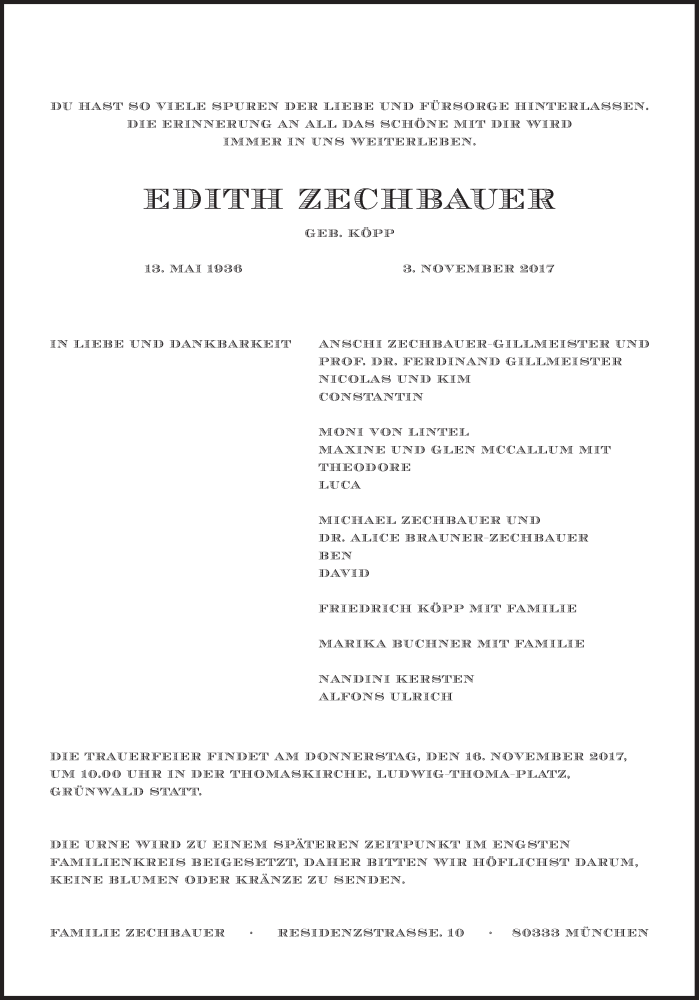Hier finden Sie alle Traueranzeigen aus der Zeitung, die bisher für Edith Zechbauer erschienen sind. Weitere Traueranzeigen, die in der Zeitung erscheinen, werden hier ebenfalls aufgelistet