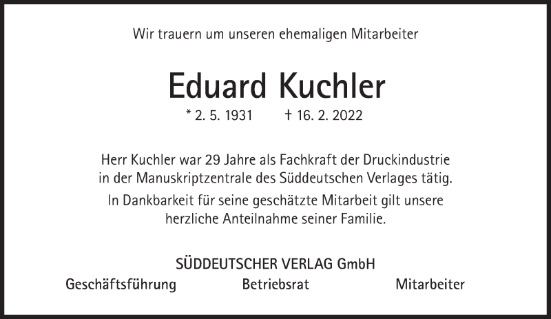 Hier finden Sie alle Traueranzeigen aus der Zeitung, die bisher für Eduard Kuchler erschienen sind. Weitere Traueranzeigen, die in der Zeitung erscheinen, werden hier ebenfalls aufgelistet