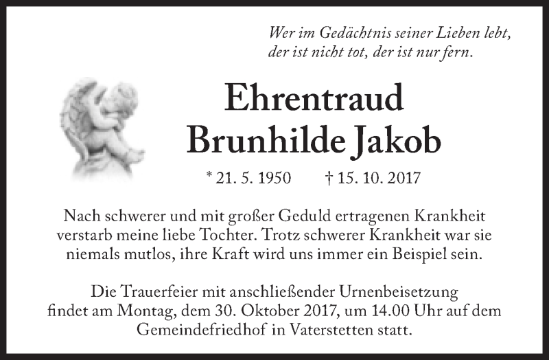 Hier finden Sie alle Traueranzeigen aus der Zeitung, die bisher für Ehrentraud Brunhilde Jakob erschienen sind. Weitere Traueranzeigen, die in der Zeitung erscheinen, werden hier ebenfalls aufgelistet