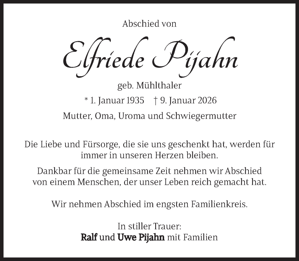 Hier finden Sie alle Traueranzeigen aus der Zeitung, die bisher für Elfriede Pijahn erschienen sind. Weitere Traueranzeigen, die in der Zeitung erscheinen, werden hier ebenfalls aufgelistet