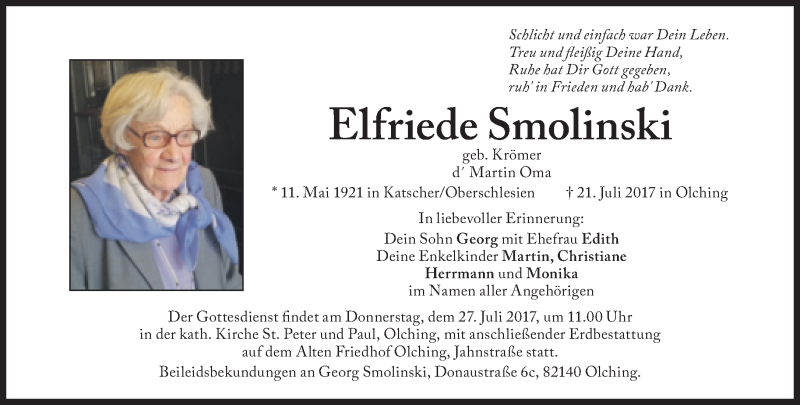 Hier finden Sie alle Traueranzeigen aus der Zeitung, die bisher für Elfriede Smolinski erschienen sind. Weitere Traueranzeigen, die in der Zeitung erscheinen, werden hier ebenfalls aufgelistet