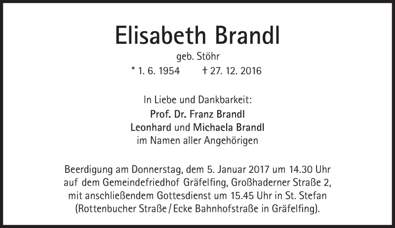 Hier finden Sie alle Traueranzeigen aus der Zeitung, die bisher für Elisabeth Brandl erschienen sind. Weitere Traueranzeigen, die in der Zeitung erscheinen, werden hier ebenfalls aufgelistet