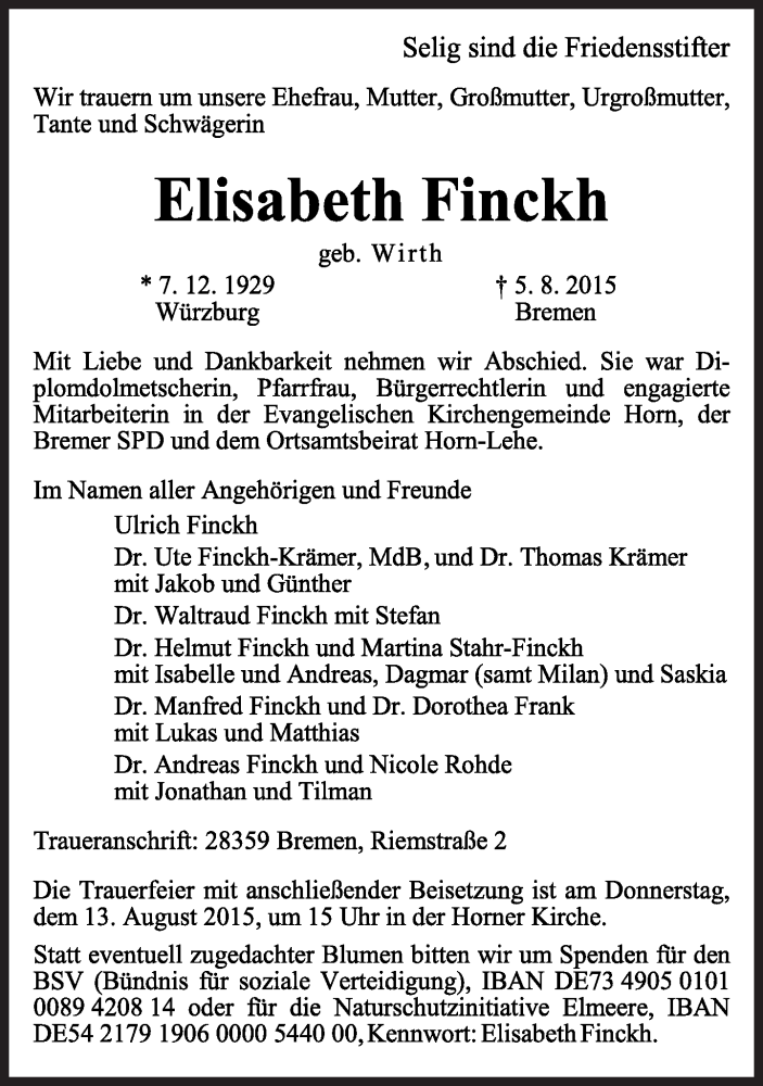 Hier finden Sie alle Traueranzeigen aus der Zeitung, die bisher für Elisabeth Finckh erschienen sind. Weitere Traueranzeigen, die in der Zeitung erscheinen, werden hier ebenfalls aufgelistet