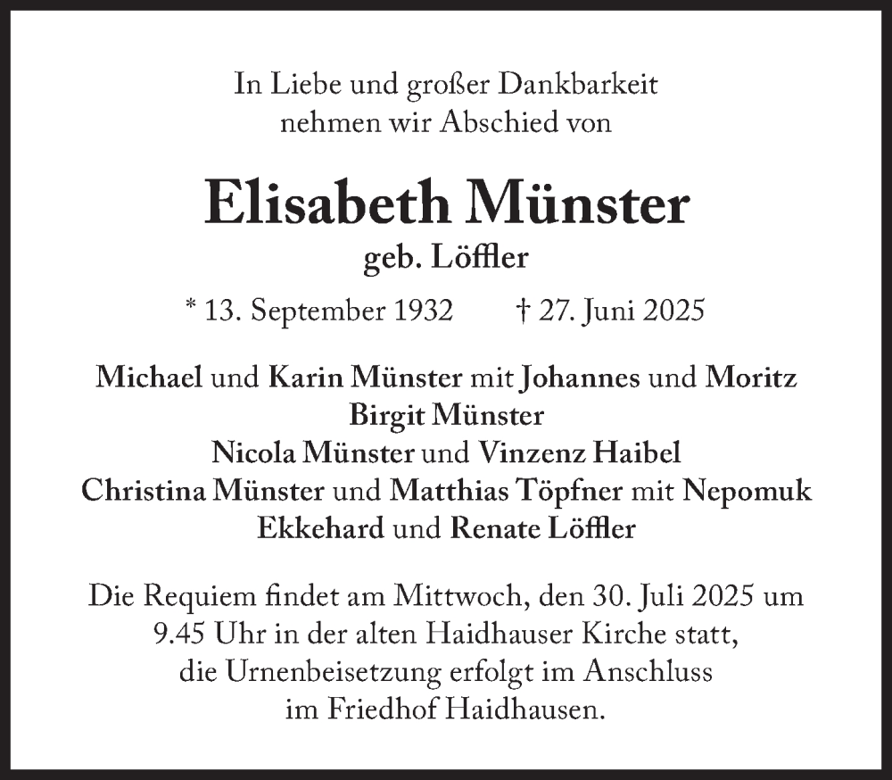Hier finden Sie alle Traueranzeigen aus der Zeitung, die bisher für Elisabeth Münster erschienen sind. Weitere Traueranzeigen, die in der Zeitung erscheinen, werden hier ebenfalls aufgelistet
