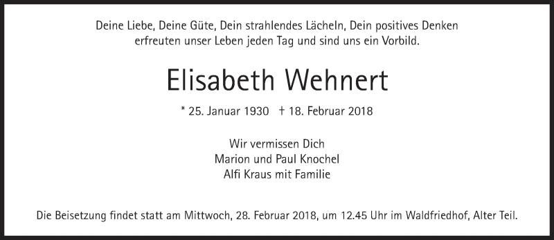 Hier finden Sie alle Traueranzeigen aus der Zeitung, die bisher für Elisabeth Wehnert erschienen sind. Weitere Traueranzeigen, die in der Zeitung erscheinen, werden hier ebenfalls aufgelistet