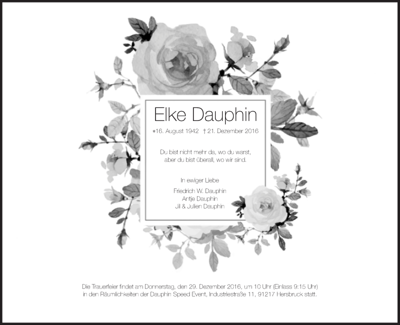 Hier finden Sie alle Traueranzeigen aus der Zeitung, die bisher für Elke Dauphin erschienen sind. Weitere Traueranzeigen, die in der Zeitung erscheinen, werden hier ebenfalls aufgelistet
