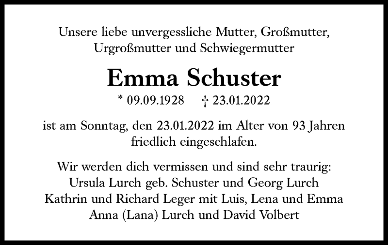 Hier finden Sie alle Traueranzeigen aus der Zeitung, die bisher für Emma Schuster erschienen sind. Weitere Traueranzeigen, die in der Zeitung erscheinen, werden hier ebenfalls aufgelistet