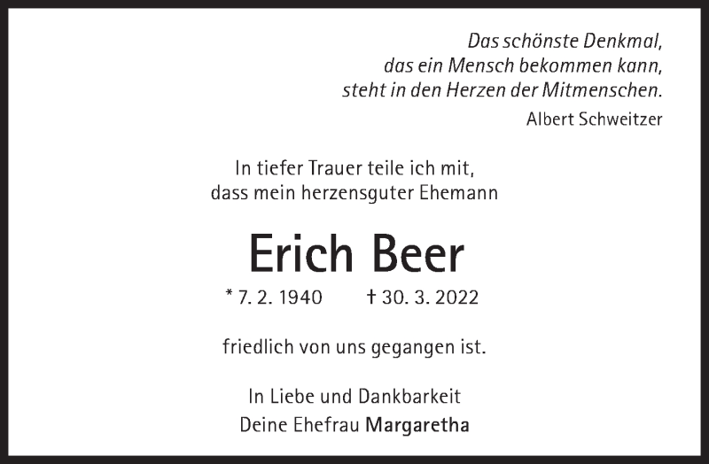 Hier finden Sie alle Traueranzeigen aus der Zeitung, die bisher für Erich Beer erschienen sind. Weitere Traueranzeigen, die in der Zeitung erscheinen, werden hier ebenfalls aufgelistet