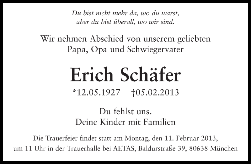 Hier finden Sie alle Traueranzeigen aus der Zeitung, die bisher für Erich Schäfer erschienen sind. Weitere Traueranzeigen, die in der Zeitung erscheinen, werden hier ebenfalls aufgelistet