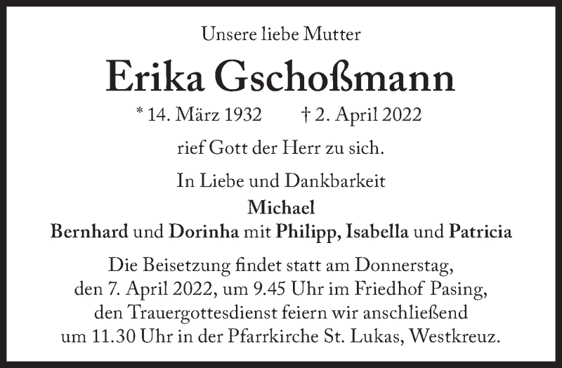 Hier finden Sie alle Traueranzeigen aus der Zeitung, die bisher für Erika Gschoßmann erschienen sind. Weitere Traueranzeigen, die in der Zeitung erscheinen, werden hier ebenfalls aufgelistet