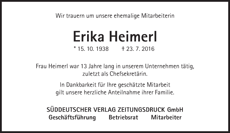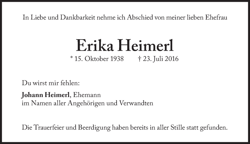 Hier finden Sie alle Traueranzeigen aus der Zeitung, die bisher für Erika Heimerl erschienen sind. Weitere Traueranzeigen, die in der Zeitung erscheinen, werden hier ebenfalls aufgelistet