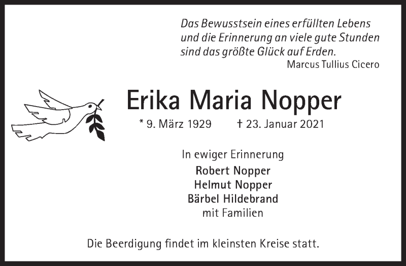 Hier finden Sie alle Traueranzeigen aus der Zeitung, die bisher für Erika Maria Nopper erschienen sind. Weitere Traueranzeigen, die in der Zeitung erscheinen, werden hier ebenfalls aufgelistet
