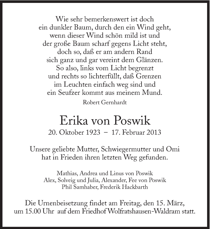 Hier finden Sie alle Traueranzeigen aus der Zeitung, die bisher für Erika von Poswik erschienen sind. Weitere Traueranzeigen, die in der Zeitung erscheinen, werden hier ebenfalls aufgelistet