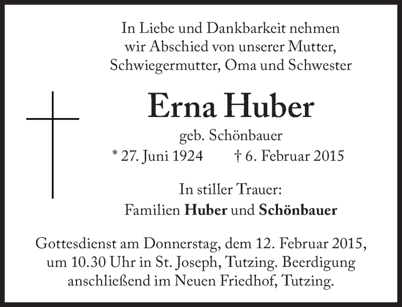 Hier finden Sie alle Traueranzeigen aus der Zeitung, die bisher für Erna Huber erschienen sind. Weitere Traueranzeigen, die in der Zeitung erscheinen, werden hier ebenfalls aufgelistet