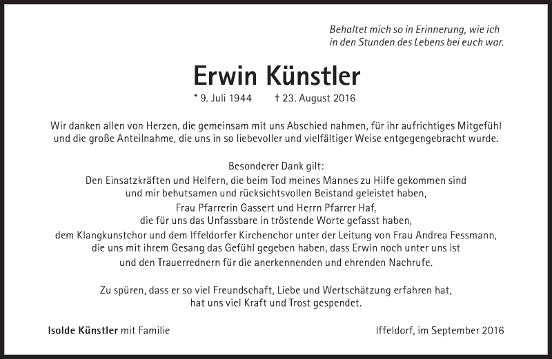 Hier finden Sie alle Traueranzeigen aus der Zeitung, die bisher für Erwin Künstler erschienen sind. Weitere Traueranzeigen, die in der Zeitung erscheinen, werden hier ebenfalls aufgelistet