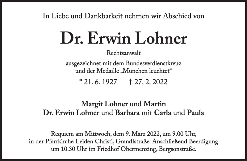 Hier finden Sie alle Traueranzeigen aus der Zeitung, die bisher für Erwin Lohner erschienen sind. Weitere Traueranzeigen, die in der Zeitung erscheinen, werden hier ebenfalls aufgelistet