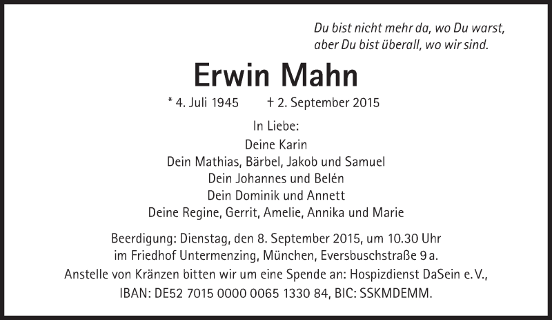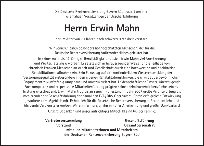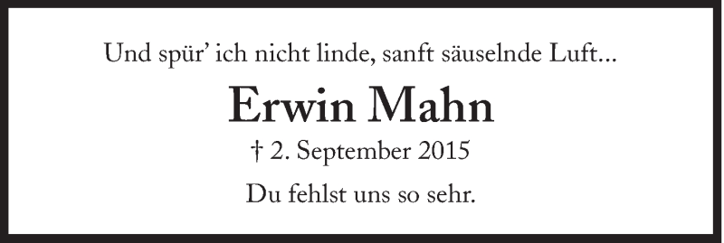 Hier finden Sie alle Traueranzeigen aus der Zeitung, die bisher für Erwin Mahn erschienen sind. Weitere Traueranzeigen, die in der Zeitung erscheinen, werden hier ebenfalls aufgelistet