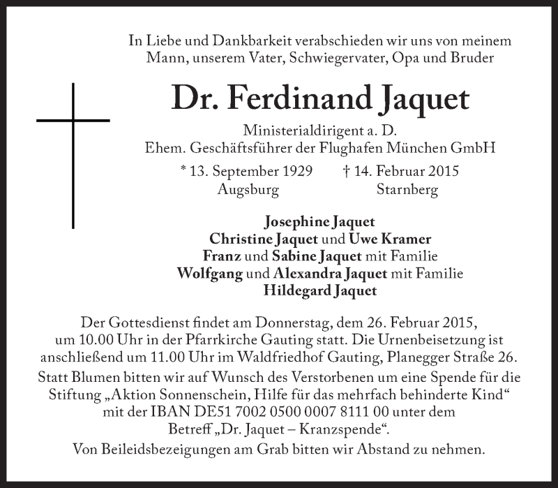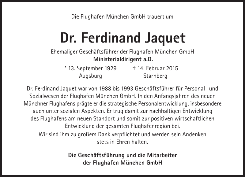 Hier finden Sie alle Traueranzeigen aus der Zeitung, die bisher für Ferdinand Jaquet erschienen sind. Weitere Traueranzeigen, die in der Zeitung erscheinen, werden hier ebenfalls aufgelistet