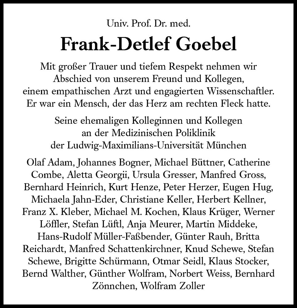 Hier finden Sie alle Traueranzeigen aus der Zeitung, die bisher für Frank-Detlef Goebel erschienen sind. Weitere Traueranzeigen, die in der Zeitung erscheinen, werden hier ebenfalls aufgelistet