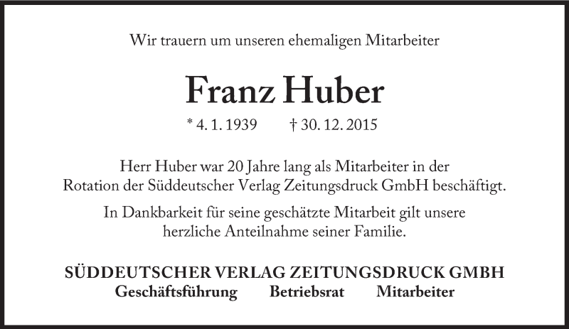 Hier finden Sie alle Traueranzeigen aus der Zeitung, die bisher für Franz Huber erschienen sind. Weitere Traueranzeigen, die in der Zeitung erscheinen, werden hier ebenfalls aufgelistet