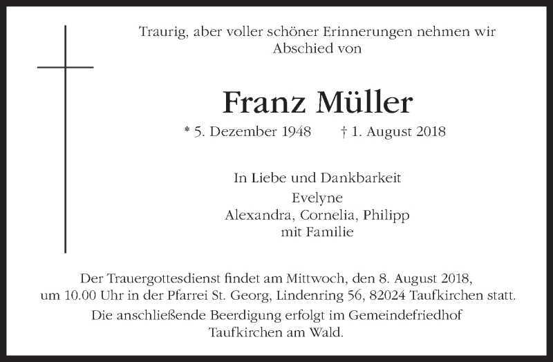 Hier finden Sie alle Traueranzeigen aus der Zeitung, die bisher für Franz Müller erschienen sind. Weitere Traueranzeigen, die in der Zeitung erscheinen, werden hier ebenfalls aufgelistet