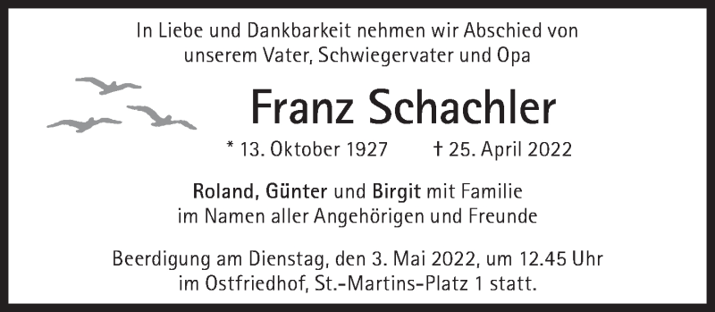 Hier finden Sie alle Traueranzeigen aus der Zeitung, die bisher für Franz Schachler erschienen sind. Weitere Traueranzeigen, die in der Zeitung erscheinen, werden hier ebenfalls aufgelistet