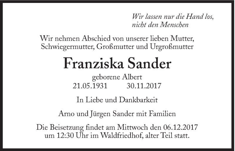 Hier finden Sie alle Traueranzeigen aus der Zeitung, die bisher für Franziska Sander erschienen sind. Weitere Traueranzeigen, die in der Zeitung erscheinen, werden hier ebenfalls aufgelistet