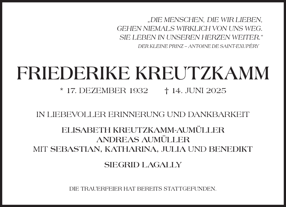 Hier finden Sie alle Traueranzeigen aus der Zeitung, die bisher für Friederike Kreutzkamm erschienen sind. Weitere Traueranzeigen, die in der Zeitung erscheinen, werden hier ebenfalls aufgelistet