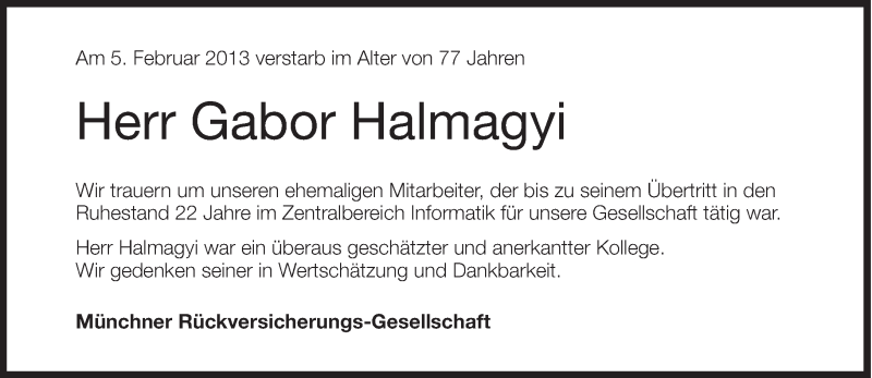 Hier finden Sie alle Traueranzeigen aus der Zeitung, die bisher für Gabor Halmagyi erschienen sind. Weitere Traueranzeigen, die in der Zeitung erscheinen, werden hier ebenfalls aufgelistet