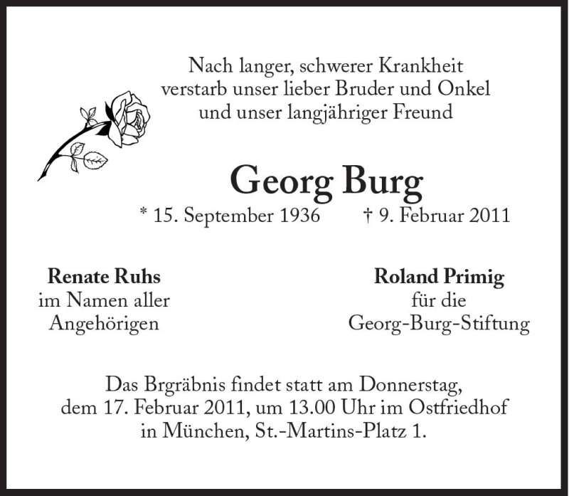 Hier finden Sie alle Traueranzeigen aus der Zeitung, die bisher für Georg Burg erschienen sind. Weitere Traueranzeigen, die in der Zeitung erscheinen, werden hier ebenfalls aufgelistet