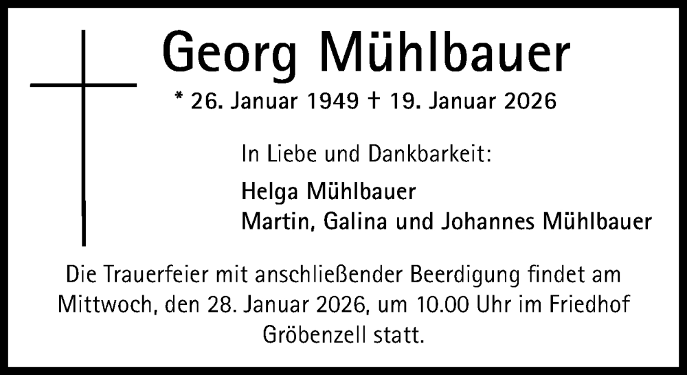 Hier finden Sie alle Traueranzeigen aus der Zeitung, die bisher für Georg Mühlbauer erschienen sind. Weitere Traueranzeigen, die in der Zeitung erscheinen, werden hier ebenfalls aufgelistet